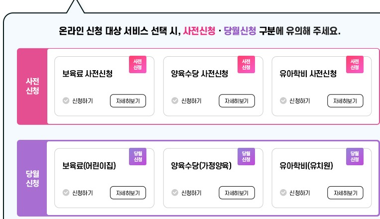 • 어린이집 (보육료)- 유치원 (유아학비): 신청필요